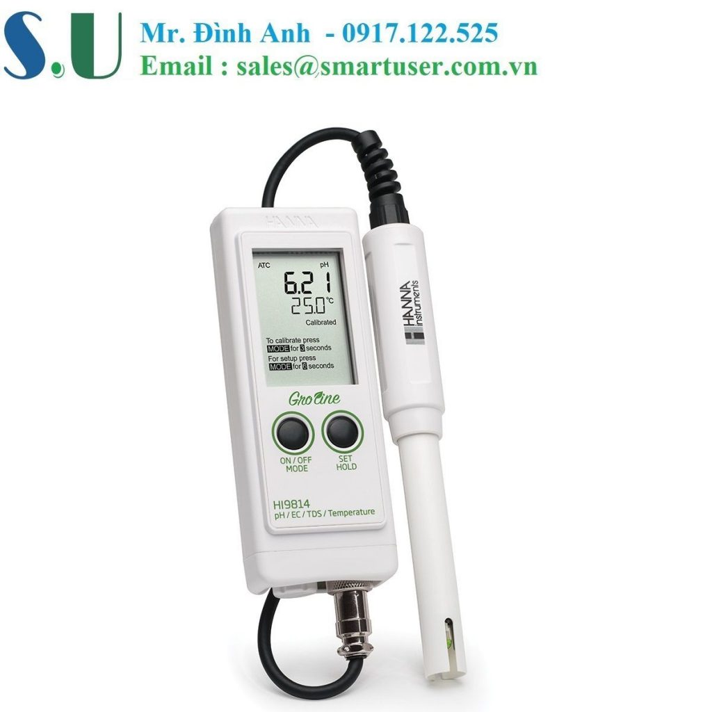 HI9814 là máy đo cầm tay có màn hình LCD đa cấp lớn hiển thị cả giá trị pH, EC hoặc TDS và nhiệt độ cùng một lúc. Giá trị pH được hiển thị với độ phân giải 0.01 và độ chính xác +/- 0.01 pH trong khi EC và TDS được hiển thị với độ phân giải 0.01 mS/cm và 10 ppm (mg/L) và độ chính xác 2% toàn thang. Một cảm biến nhiệt độ tích hợp cho phép bù nhiệt độ tự động cho EC và TDS. HI9814 có nhiều tính năng tiên tiến được tìm thấy trong thiết bị cầm tay đắt tiền như hiệu chuẩn tự động, nhận đệm/chuẩn và bù nhiệt. Màn hình LCD hiển thị các chỉ số ổn định và tình trạng hiệu chuẩn, cũng như tin nhắn hướng dẫn. Mức phần trăm pin được hiển thị lúc khởi động. Điện cực pH khuếch đại HI1285-7 thân polypropylene, tích hợp cảm biến EC/TDS và nhiệt độ. Bộ khuếch đại cho điện cực pH ngăn chặn độ ẩm và các nguồn nhiễu điện như bơm tuần hoàn, động cơ, và chấn lưu. HI9814 là máy đo đa chỉ tiêu được thiết kế chuyên dùng trong thủy canh, nhà kính, và các ứng dụng nông nghiệp.