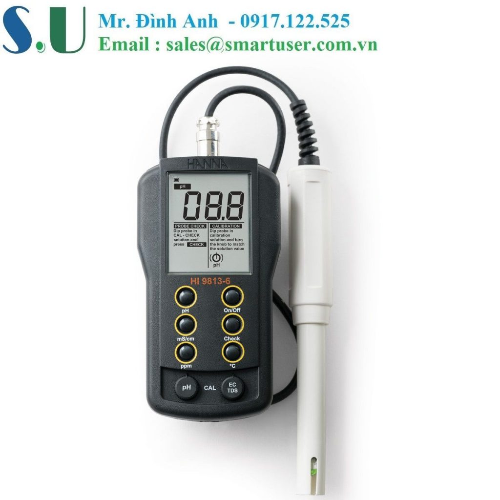 HI9813-6 là máy đo cầm tay có màn hình LCD lớn, hiển thị giá trị pH, EC, TDS/nhiệt độ cùng với hướng dẫn. Giá trị pH được hiển thị với độ phân giải 0.1 và độ chính xác +/- 0.1 pH trong khi EC và TDS đọc là 0.01 mS/cm và độ phân giải 1 ppm (mg/L) và 2% f.s. Thang đo EC của HI9813-6 là 0.00-4.00 mS/cm và TDS là 0-1999 ppm. Hệ số hiệu chỉnh nhiệt độ (β) mặc định là 2%/oC và tự động bù nhiệt độ cho EC và TDS. HI9813-6 là một máy đo pH / EC / TDS cơ bản được hiệu chuẩn bằng tay một điểm duy nhất với 2 nút tinh chỉnh. pH được hiệu chỉnh tại điểm 7.01 trong khi EC/TDS tại 1.41 mS/cm (1413 µs/cm) hoặc 1500 ppm. Màn hình LCD hiển thị lượng pin còn lại cũng như tin nhắn hướng dẫn. Đầu dò HI1285-6 thân polypropylene, điện cực pH khuếch đại tích hợp cảm biến EC / TDS và nhiệt độ. Bộ khuếch đại cho điện cực pH ngăn chặn độ ẩm và nhiễu điện từ các nguồn phổ biến bao gồm từ động cơ, chấn lưu hoặc máy bơm. HI9813-6 là máy đo đa chỉ tiêu dùng trong nông nghiệp, nhà kính và thủy canh.
